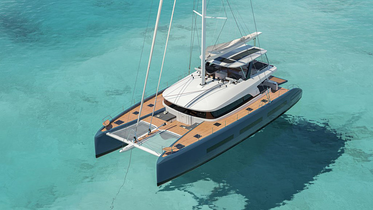 - Dotado con un gran flybridge y que presenta características únicas en un multicasco, como la gran plataforma de baño en popa, tipo beach club y una cabina con terraza abatible