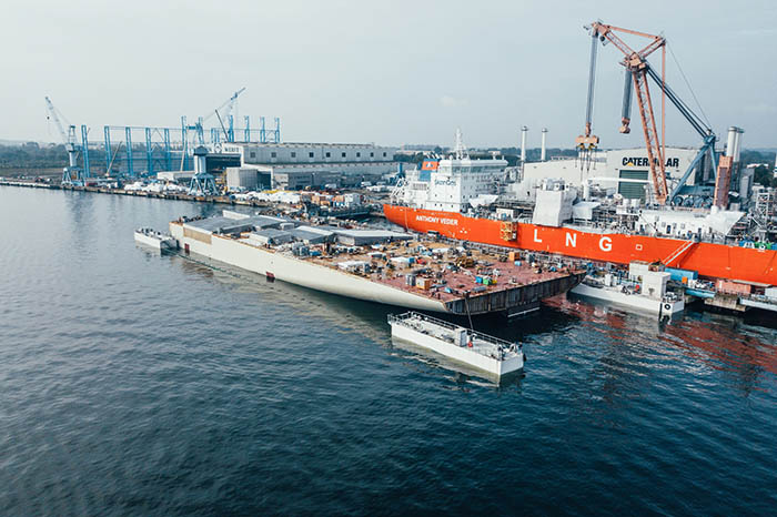 El primero de estos dos bloques, denominados FERU (siglas de Floating Engine Room Units), tiene 120 m de eslora, 42 m de manga, tres cubiertas de altura y ya se encuentran instalados los cuatro motores dual-fuel Caterpillar. Tomó por primera vez contacto con el agua del río Warnow el pasado jueves 21 de septiembre.