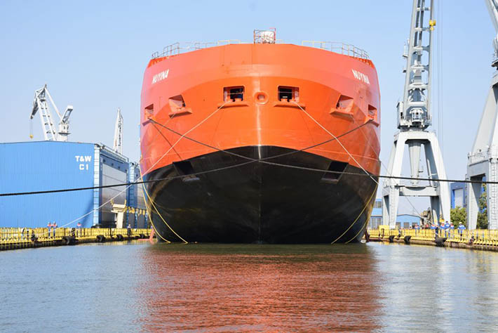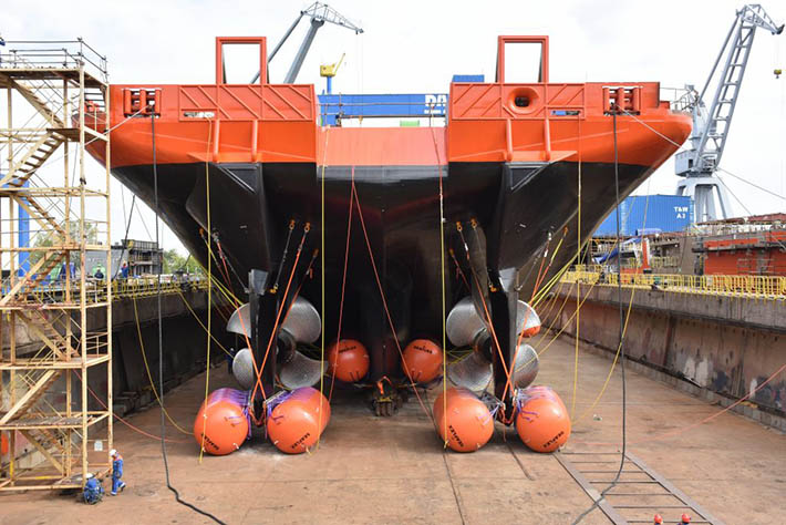 Casi tres años después, el casco del RSV Nuyina toca por primera vez el agua tras su flotadura en las instalaciones de Damen Shipyards Galati.