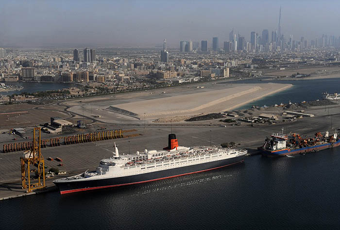 Dubai World compró en 2007 a Cunard este buque por un valor de 100 millones de dólares hace ya 10 años este buque que finalmente luce en el puerto de Mina Rashid como hotel flotante.